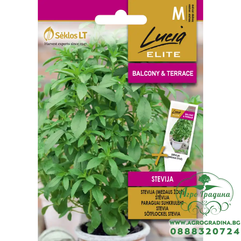 Стевията ( МЕДЕНА БИЛКА )  е многогодишно разстение,10-16 пъти по-сладко от захарта. Височината му е около 60-80 см. Листата на растението могат да се добавят към чай, кафе, компот, печива – всичко, което се подслажда. Растението е почти безкалорично и е безопасно за диабетици. Отглежда се в стаи, през лятото - на балкони отвън, растението не презимува. При отглеждане на стевия на перваза на прозореца в края на есента и зимата е необходимо да се инсталира допълнително осветление, за да се създадат благоприятни условия за растеж. Семената са малки,  покълват трудно и дълго време. Много е важно да се създадат оптимални условия за покълване. За да покълнат семената е важно посевът да не се преполива и да не се изсушава. Семената са малки, засети в земята не се покриват. От 10 семена ще можете да отгледате 4-5 растения, тоест 10 семена ще са достатъчни за засаждане на 4-5 саксии с по 1 растение. При отглеждане се препоръчва пестеливо използване на азотни торове, които "намаляват" сладостта на листата.