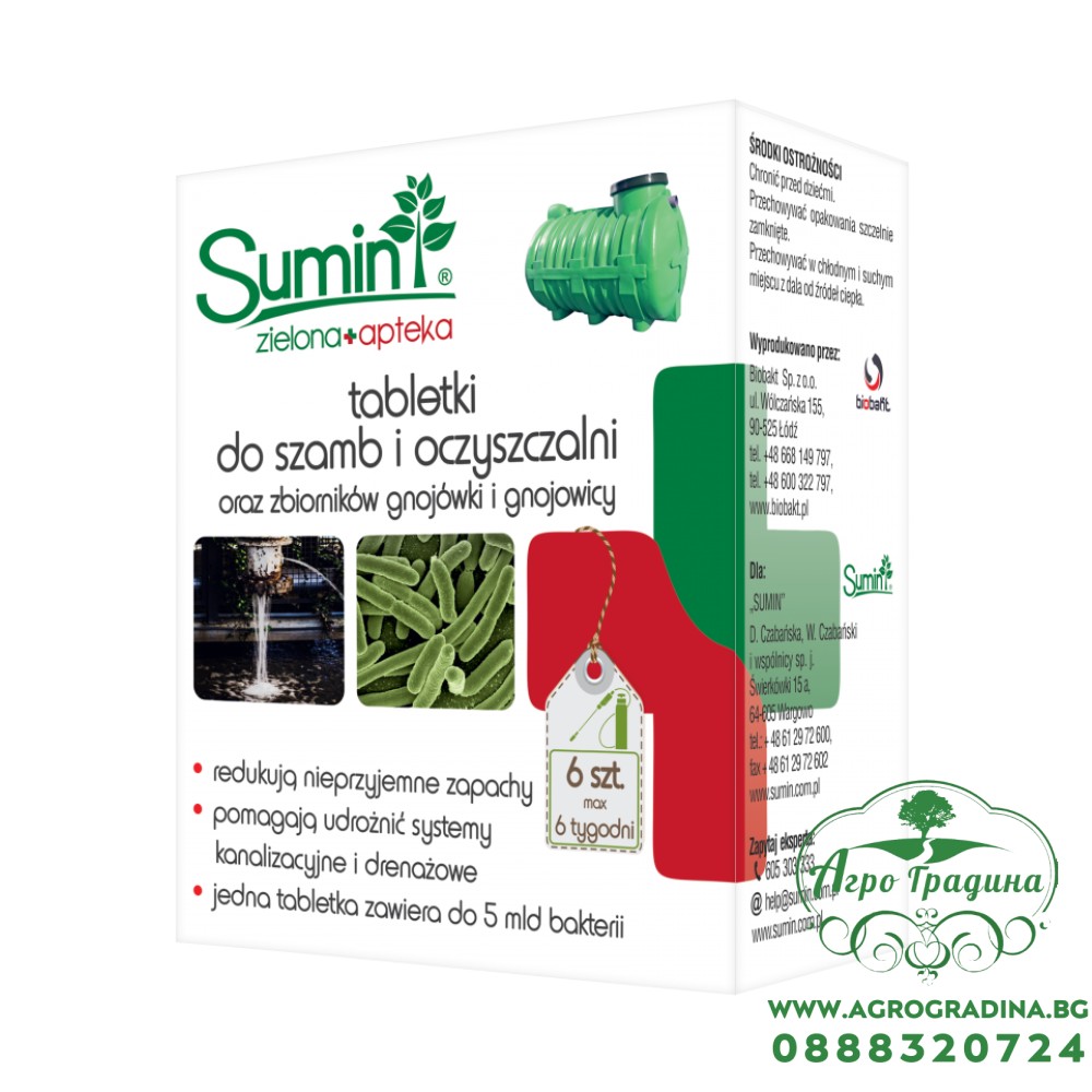 От онлайн магазин agrogradina.bg имаме удоволствието да ви представим един от най-ефективните продукти за грижа за вашата канализационна система и отпадъчни води - Сумин /  Sumin 1x6. Това са таблетки за канализация и отпадъци, разработени със специална формула, която подобрява работата на всички видове битови пречиствателни станции. С тях ще поддържате вашата система в оптимално състояние, като намалявате риска от заседнали отпадъчни вещества и неприятни миризми.
