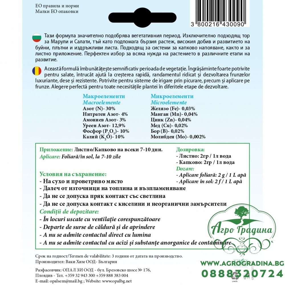 Тази формула значително подобрява вегетативния период. Изключително подходящ тор за Марули и Салати, тък като подпомага бързия растеж, високия добив и развитието на буйни, плътни и издържливи листа. Подходящ за системи за капково напояване, както и за листно приложение. Перфектен избар за всяка нужда на растението в различните етапи на развитие.