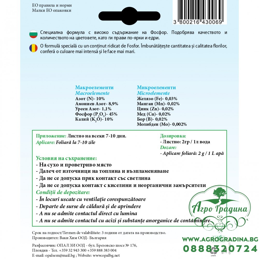 Специална формула с високо съдържание на фосфор. Подобрява качеството и количеството на цветовете, като ги прави по.ярки и едри.