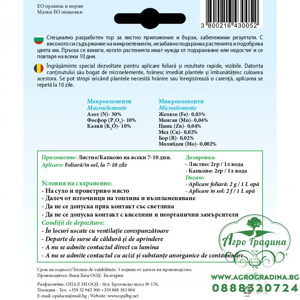 Специално разработен тор за листно приложение и бързи, забележими резултати. С високото си съдържание на микроелементи, незабавно подхранва растенията и подобрява цвета им. Пръска се винаги, когато растенията имат нужда от подхранване или недостиг и се повтаря на всеки 10 дни