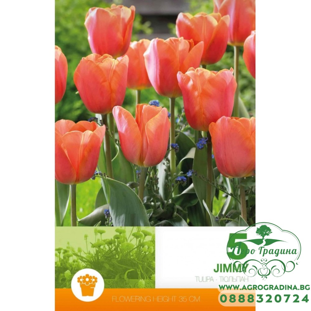 Tulip Jimmy е елегантен сорт лале с ярко оранжеви цветове, цъфтящ през април–юни. Подходящ е за засаждане в лехи, саксии и на балкони. Отличава се с компактна височина около 35 см, което го прави подходящ за отглеждане както самостоятелно, така и в комбинация с други пролетни цветя. Лалето е многогодишно растение и при правилна грижа може да краси едно и също място години наред.