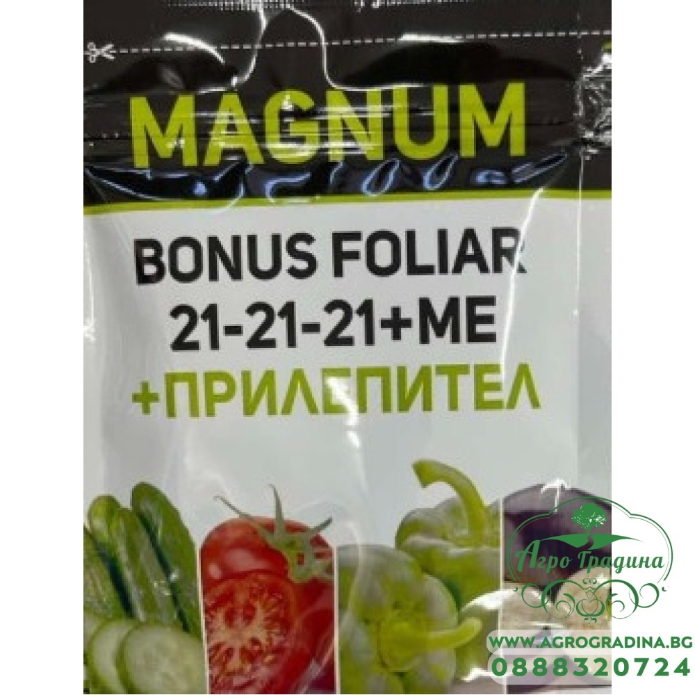 Онлайн магазин agrogradina.bg представя Универсален водоразтворим тор Magnum Bonus foliar 21-21-21+ Ме с прилепител, за листно приложение - малка инвестиция, която води до големи резултати. Изключително балансирана формула!