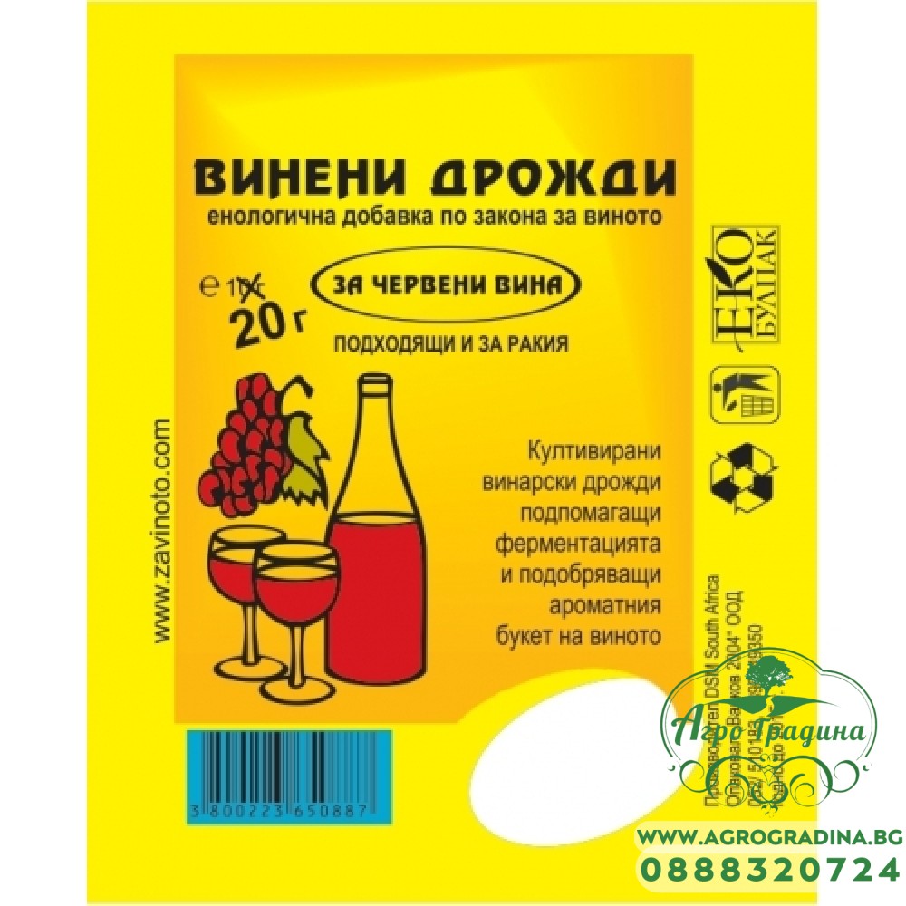 Винени дрожди (червени вина) Дозировка: 20гр на 100литра вино или плодов материал. Приложение: Съдържанието се изсипва в 0,5л. хладка (25-30°)вода и се разбърква.Изсипва се в 10л. съд и се добавя 2-3 литра от шират... Прочети повече...