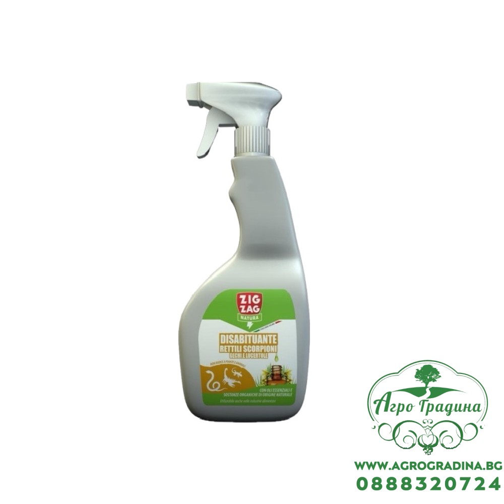 Онлайн магазин agrogradina.bg представя готов за употреба воден разтвор, спрей без газ, на основата на етерични масла и естествени органични вещества, с неприятна миризма за змии, гекони, гущери, влечуги и скорпиони, но приятна за хората - Zig Zag Nature.